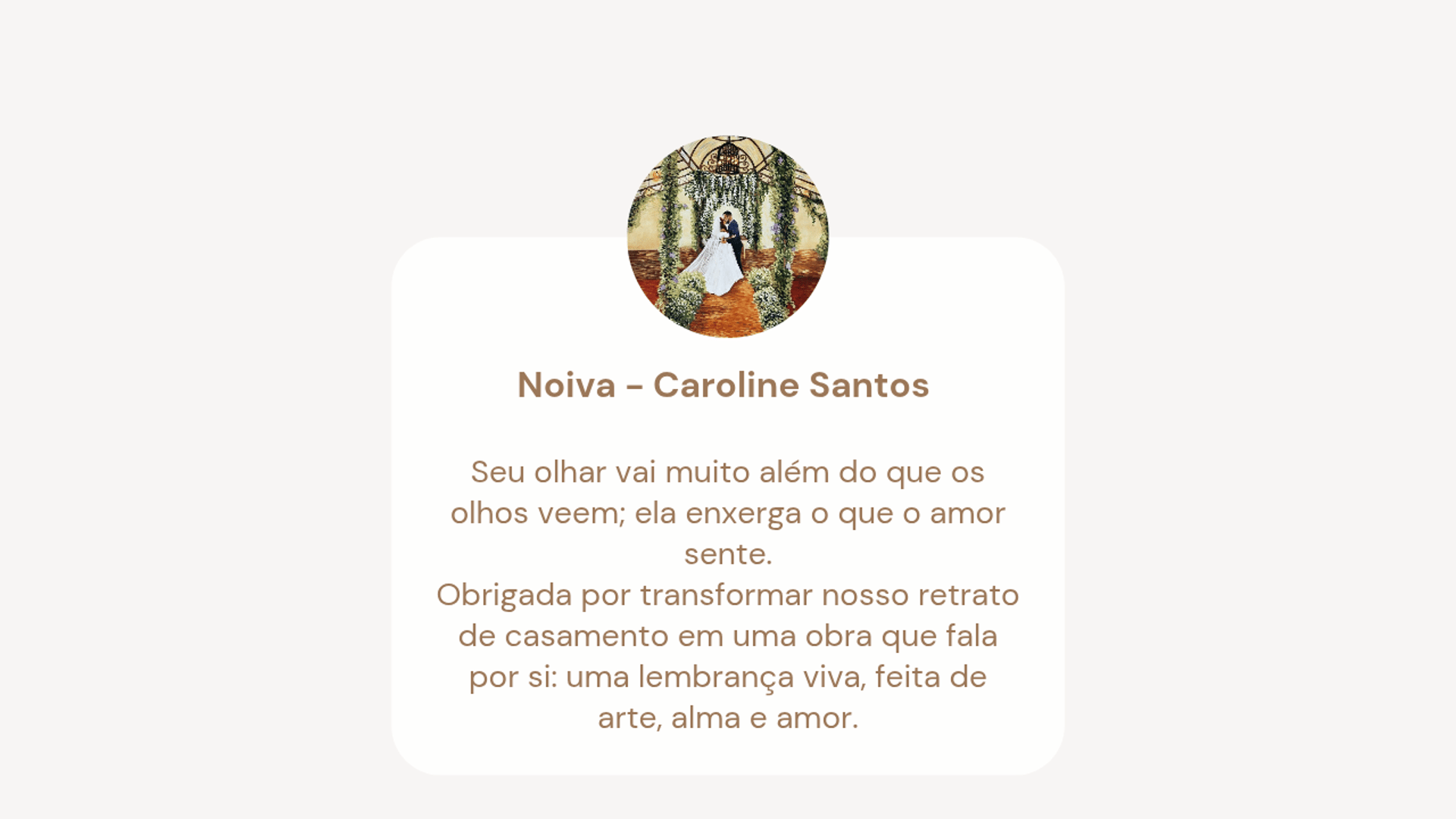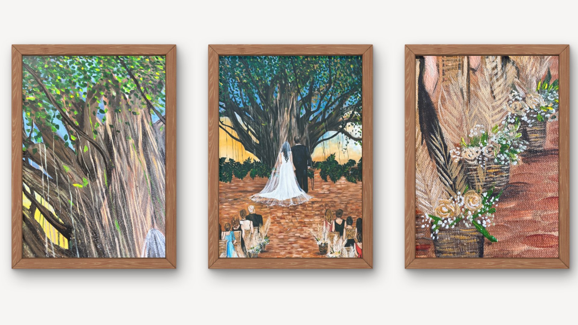 ● Com o término do evento, levo a obra ao meu ateliê para os retoques finais, aplico o verniz de proteção e realizo o envio com moldura diretamente ao casal, garantindo sua preservação ao longo do tempo.