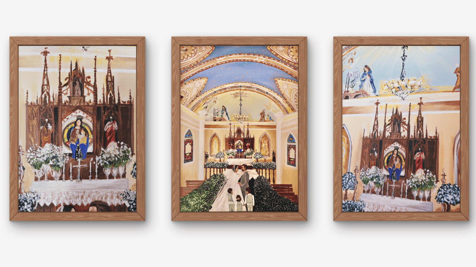● Durante a cerimônia, acompanho atentamente o momento escolhido pelo casal, como o beijo, a troca de alianças ou a saída, registrando-o diretamente na pintura.