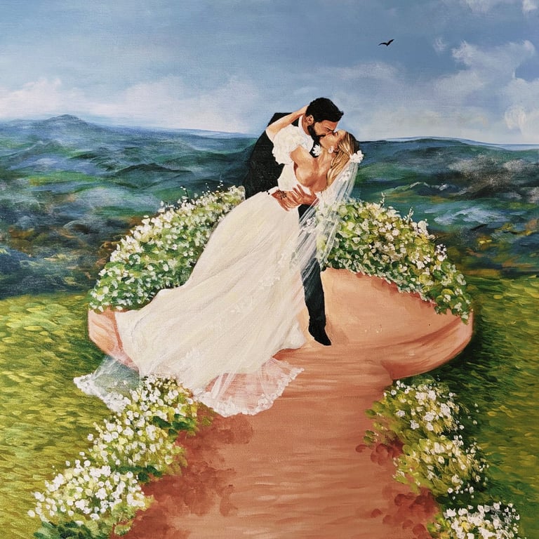 ● Com o término do evento, levo a obra ao meu ateliê para os retoques finais, aplico o verniz de proteção e realizo o envio com moldura diretamente ao casal, garantindo sua preservação ao longo do tempo.