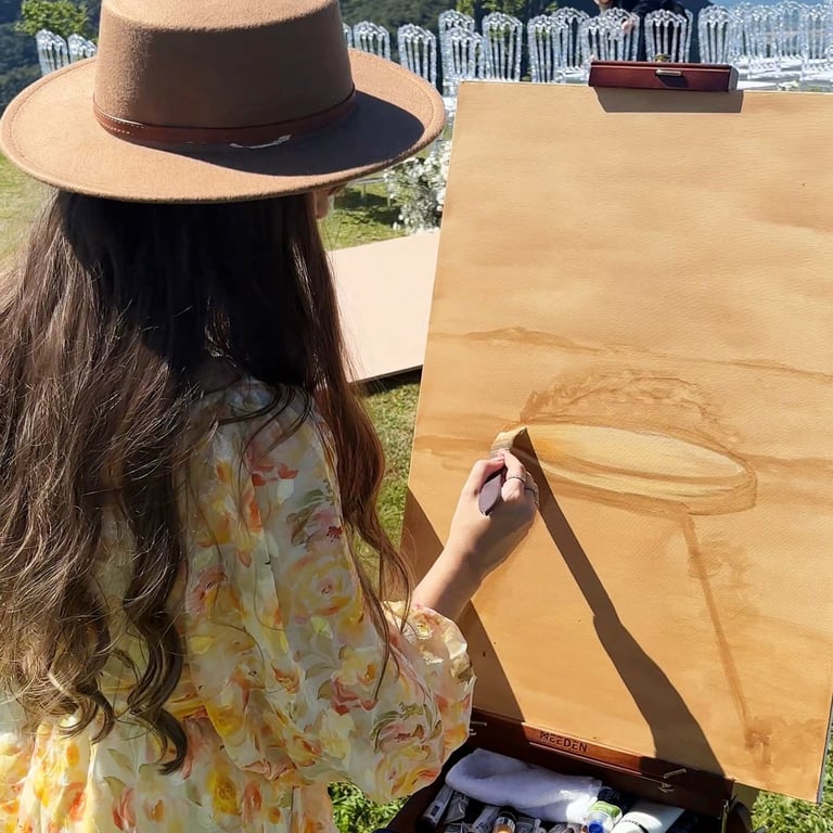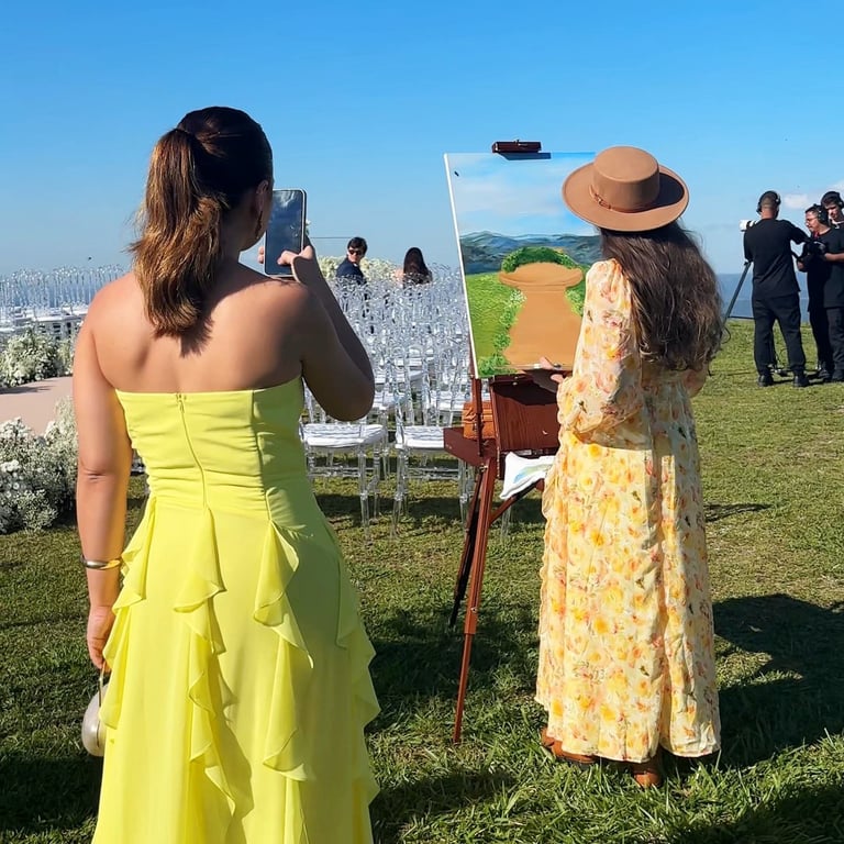 ● Durante a cerimônia, acompanho atentamente o momento escolhido pelo casal, como o beijo, a troca de alianças ou a saída, registrando-o diretamente na pintura.