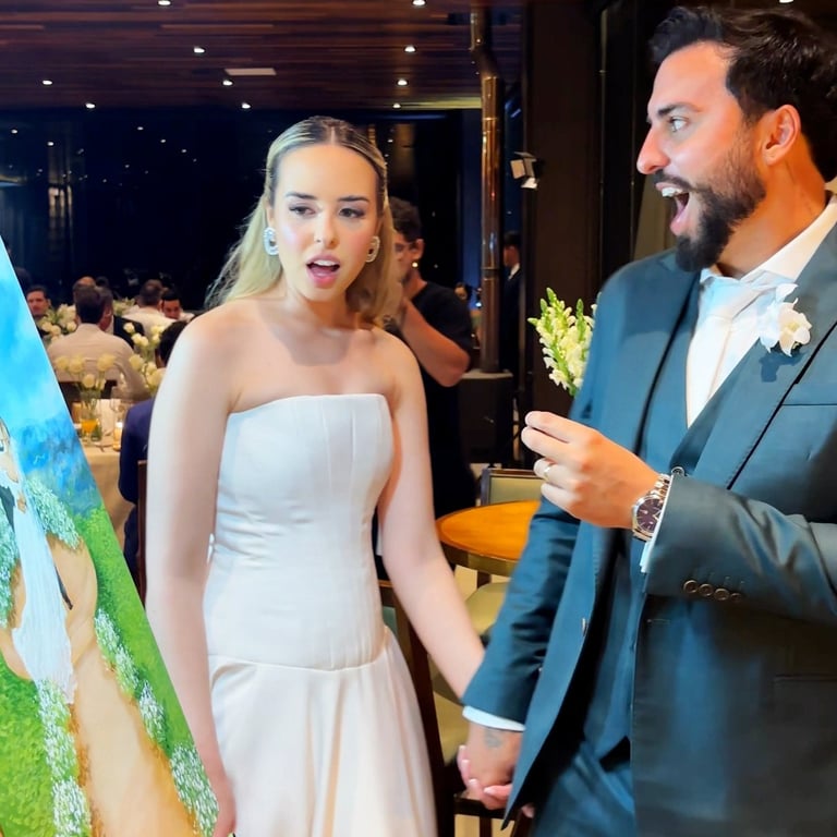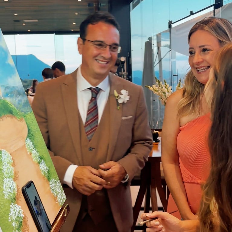A pintura ao vivo é uma experiência que chama a atenção e marca o casamento de forma única. Os convidados se envolvem, acompanham o processo e criam uma conexão especial com a obra ao longo da celebração.